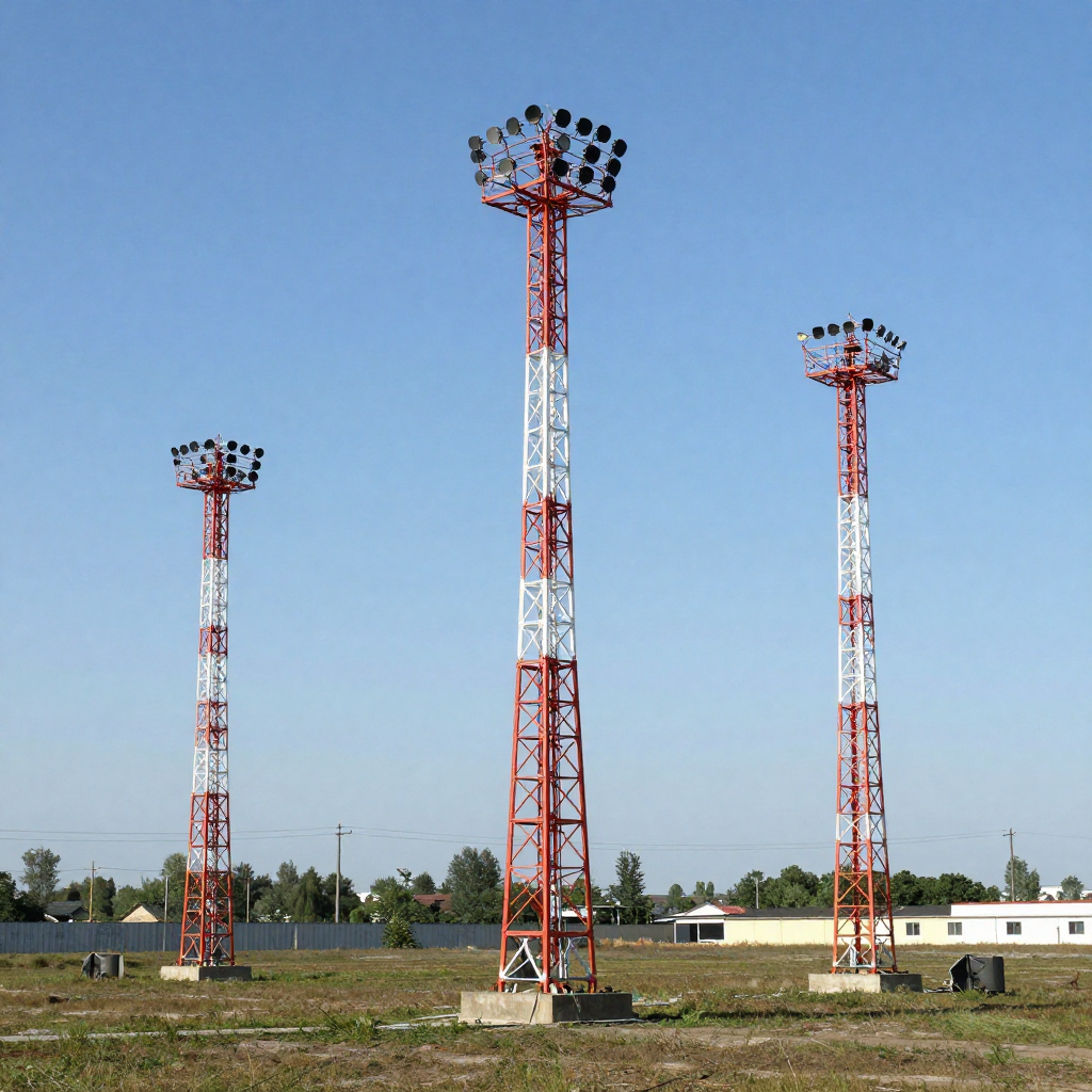 Освещение: Прожекторы могут быть установлены на мачтах, оснащены различными типами ламп (например, натриевыми, металлогалогенными или светодиодными).