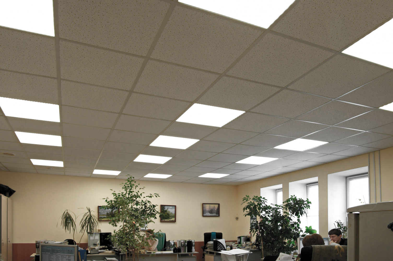 - Офисные пространства. Потолки Армстронг создают комфортную рабочую атмосферу, обеспечивая хорошую звукоизоляцию, что особенно важно в open-space офисах. Они также позволяют легко интегрировать осветительные приборы, системы вентиляции и кондиционирования, обеспечивая оптимальный микроклимат.