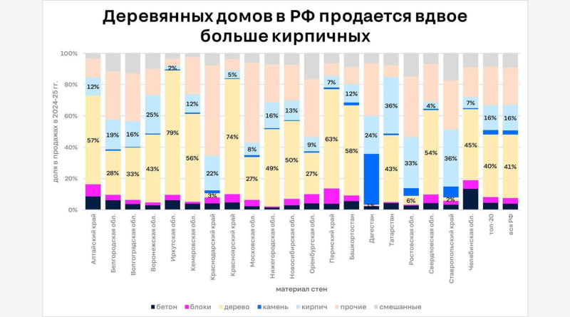 Из ТОП-20 регионов на рынке загородной недвижимости лишь в 7 большая часть продаж приходится на кирпичные (как в Краснодарском и Ставропольском краях) или каменные (как в Дагестане) строения.