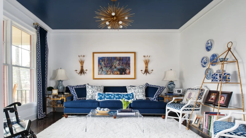 - Использовать цвета умеренно: яркие потолки лучше смотрятся в гостиных, библиотеках, прихожих — зонах, где они работают как арт-элемент.