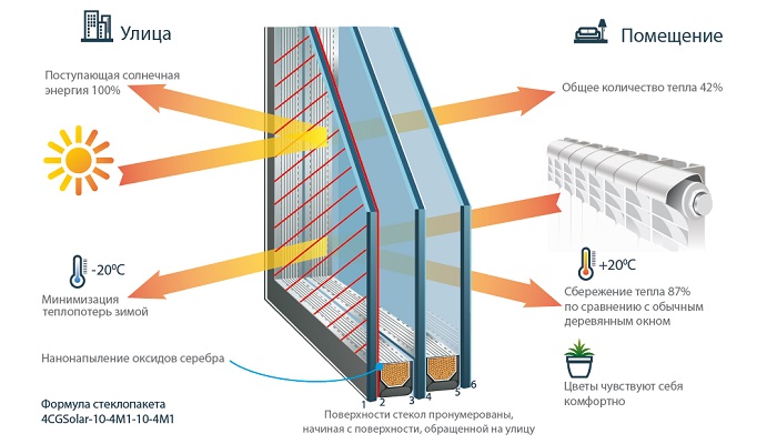 Обязательная часть МФ-окна — усовершенствованные стекла, работающие по принципу теплового зеркала. Энергия, циркулирующая внутри помещения, отражается, а поток ультрафиолетовых лучей снаружи отталкивается обратно на улицу. Таким образом, солнечные лучи не проникают в помещение, сохраняется тепло от радиаторов отопления или прохлада от кондиционера.